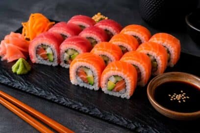 Ingredientes • 1 taza de arroz para sushi preparado• 150 g de salmón fresco en lomo o cubitos• 150 g de atún fresco en lomo